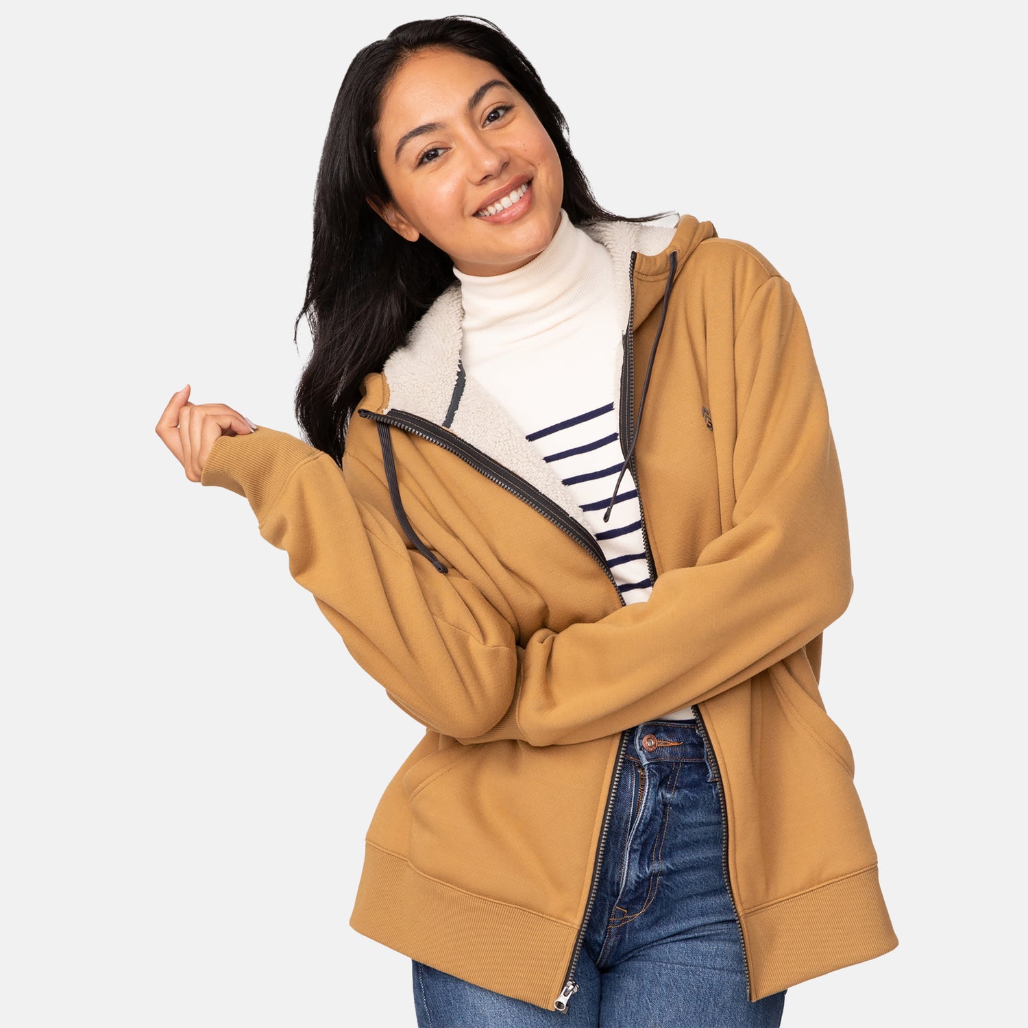 This everyday hoodie is the epitome of a versatile, fashionable and functional piece of clothing that everyone needs in their wardrobe. Whether you're facing brisk weather or simply relaxing at home, this midweight layer has you covered. It boasts an interior bonded to sherpa fabric, ensuring a soft touch against your skin and unparalleled comfort. With a timeless silhouette that suits everyone, a hood to keep you extra toasty and an adjustable drawcord for a personalized fit, this zip-up is designed with your needs in mind. The kangaroo pockets offer both convenience for storing essentials and a cozy spot for your hands, while the rib body hem and cuffs keep the cold at bay. So whether you're out and about or snuggled up on the couch, this hoodie is your go-to choice for warmth and style.