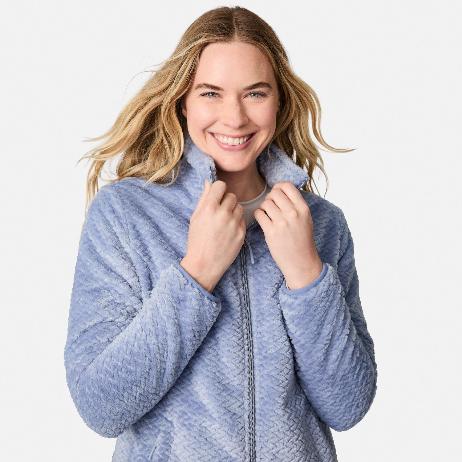 Whether you're strolling through the park or running errands in the city, the Cable Braided Butter Pile® Jacket will keep you snug and cozy, no matter your plans. Made with double-faced super-soft textured Butter Pile®, it feels like a dream against your skin. The breathable fabric ensures a fresh and comfy fit for all-day wear. Functional details like lower zipper pockets offer convenient storage for your essentials. The full-zip front closure and stand collar shield you from chilly winds, while the unique braided texture adds flair to your cold-weather style.