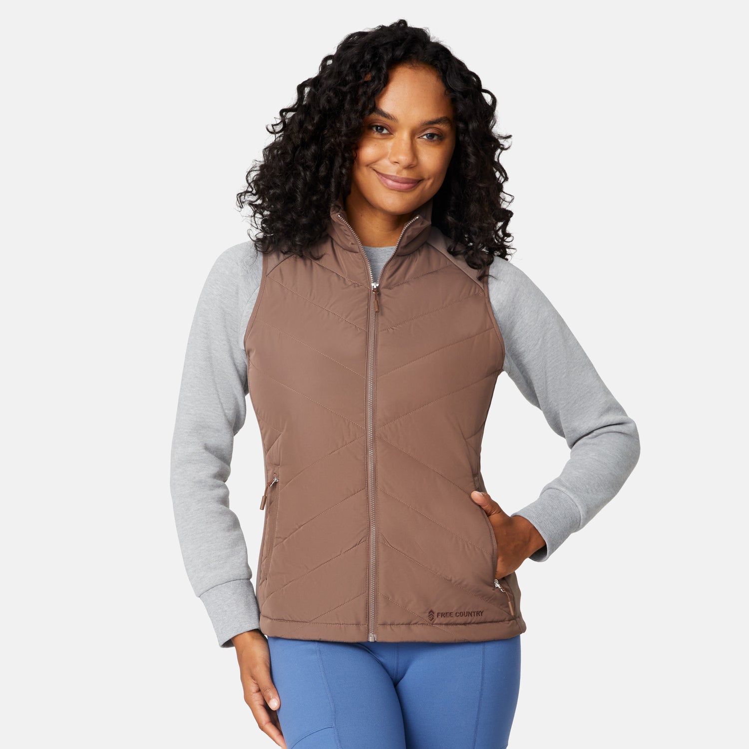 ![[Melanie is 5’8.5” wearing a size Small.] Woman wearing the Free Country Women's Quilted Hybrid Vest in light brown, featuring a unique quilted design with stretch knit panels and REPREVE® synthetic fill.](http://freecountry.com/cdn/shop/files/7LOS4633TAUPE_2312_SS24-058.jpg?v=1756224225&width=860)
