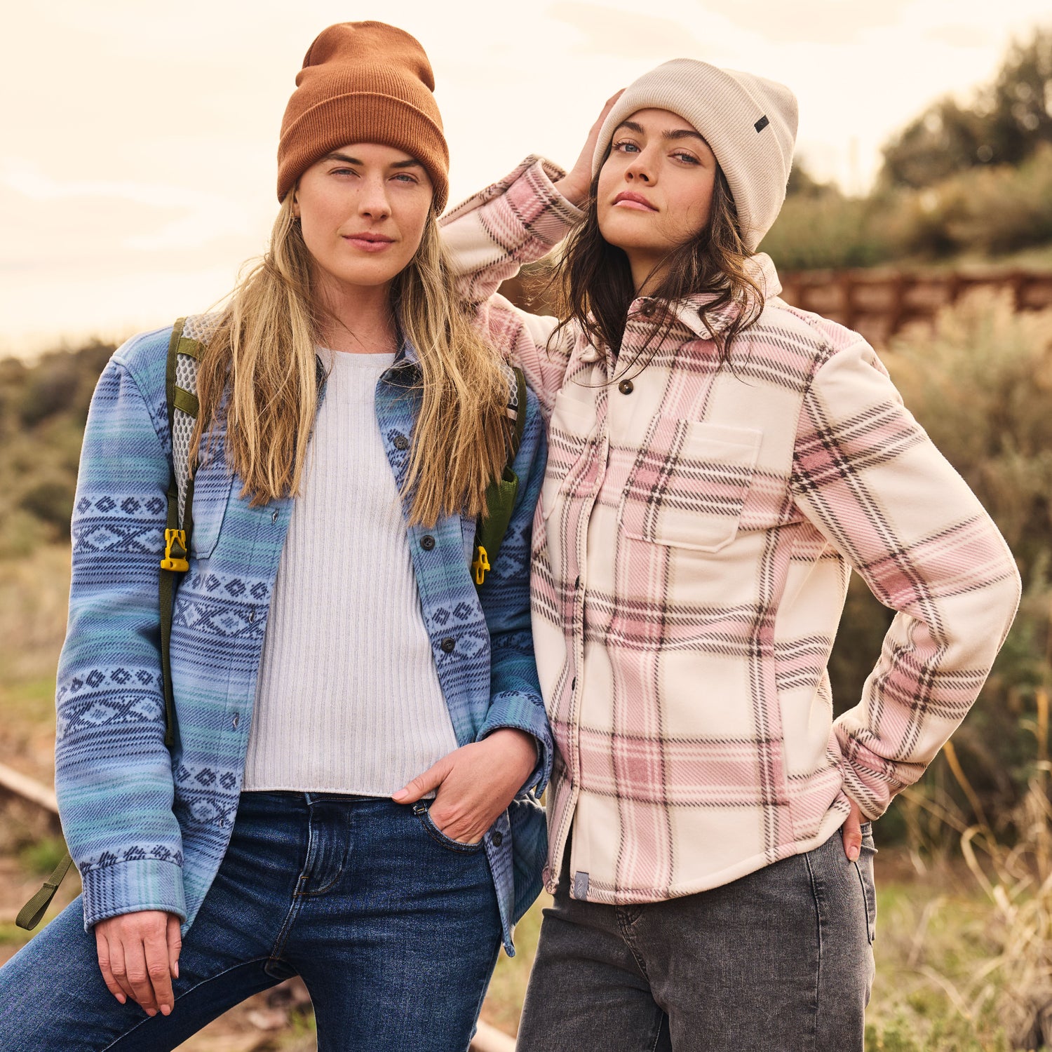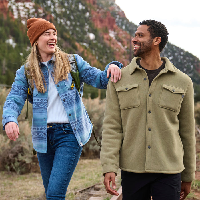 Ready to upgrade your everyday wardrobe? Chill out in style with our newest shirt-jacket hybrid. This breathable piece is the ultimate blend of cozy and cool, featuring fleece bonded to sherpa for irresistible  warmth and comfort. Whether you're rocking the classic plaid or the playful Baja-style stripe, this jacket is as stylish as it is functional.