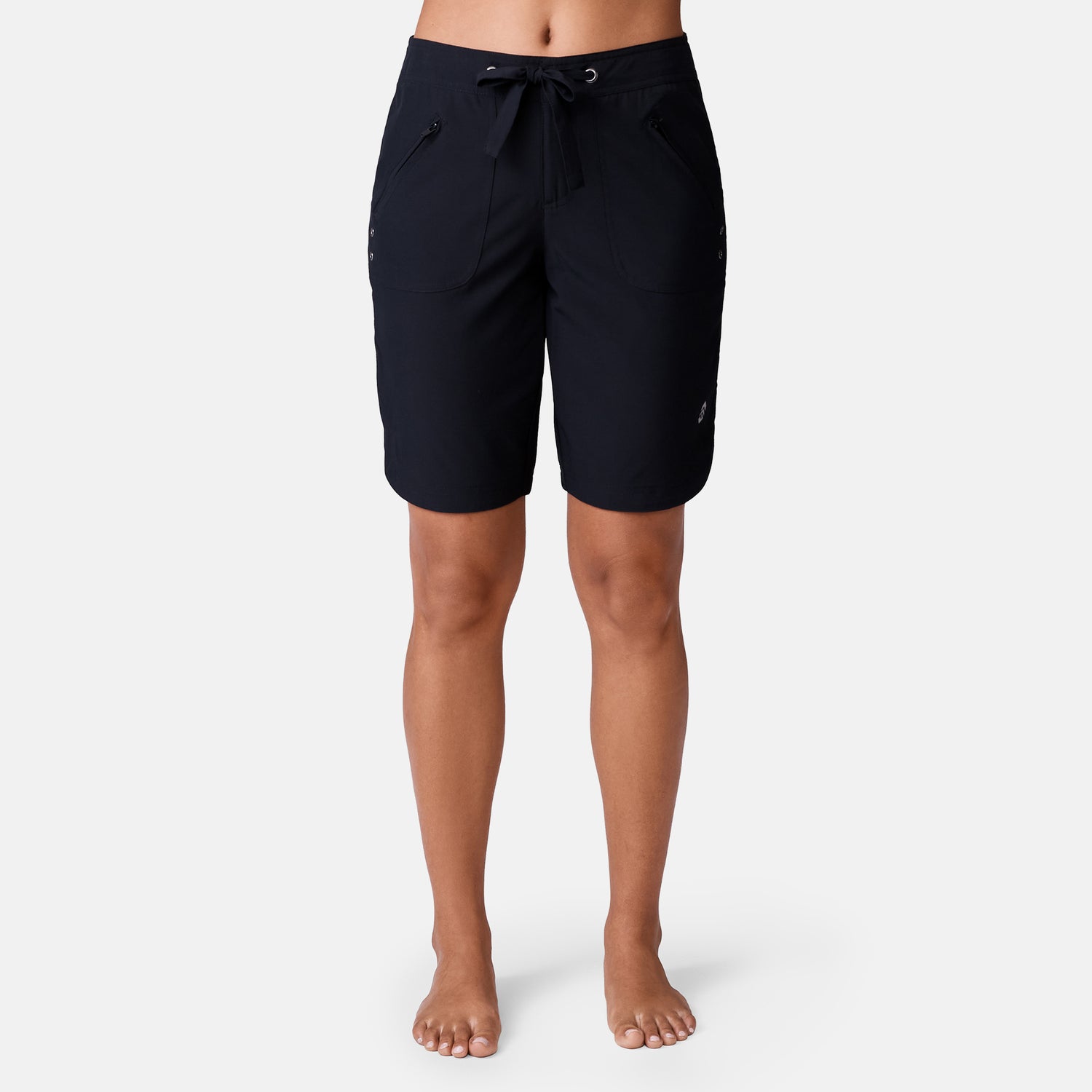 Meet your new summer MVP! These Bermuda shorts are your ticket to looking cool while staying cool, thanks to UPF 50+ protection that keeps sunburns at bay and quick-drying, lightweight material that ensures you’re never weighed down. Two front zippered pockets with eyelets for water drainage keep your essentials secure and dry, while the fly front zipper and drawcord waist make slipping them on a breeze. A scalloped hem adds just enough style to make your beach-to-boardwalk transition look effortless. Adventure-ready, sun-smart and style-savvy—these shorts are your passport to endless fun in the sun.