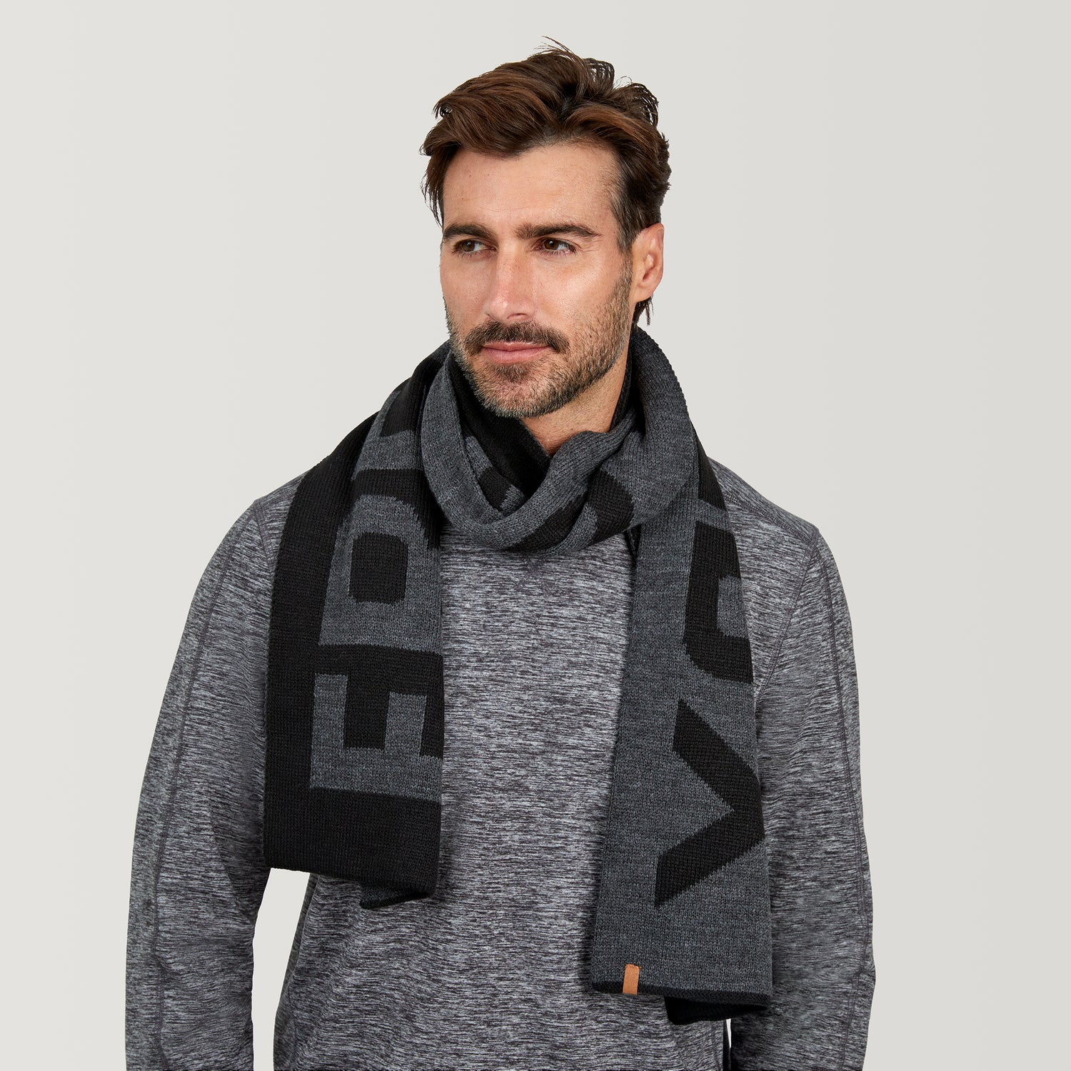 Wrap yourself up in style in comfort in this graphic scarf. The intarsia knitting reads "Free Country" in reversible black and grey colors.