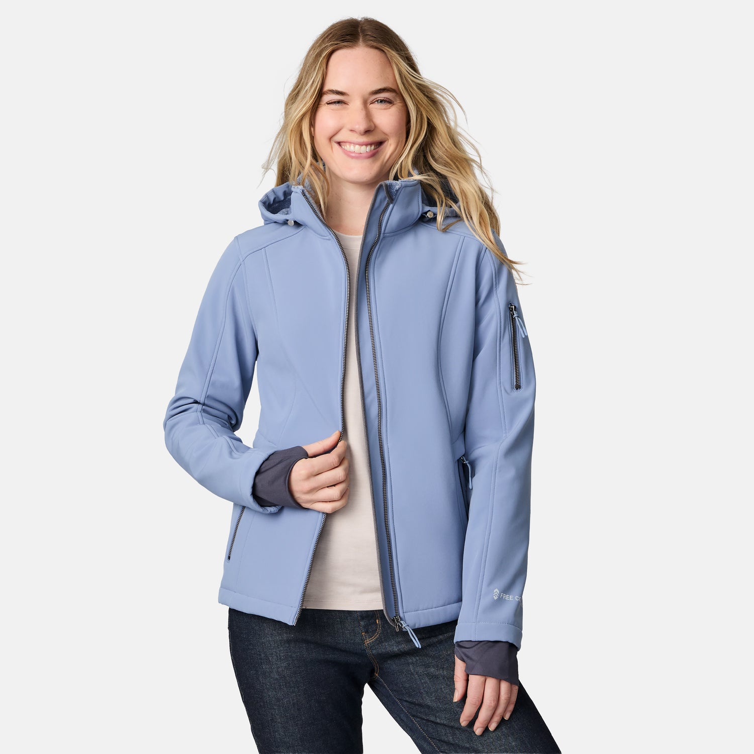 ![[Olga is 5’9” wearing a size Small.] Woman wearing Free Country Women's Aeris II Super Softshell® Jacket in light blue with a full front zipper opening, soft lining, detachable hood, and water resistant and wind resistant stretch performance fabric, light grey background. Perfect women’s jacket for fall weather.](http://freecountry.com/cdn/shop/files/518LOF4116WILLOW_2407_FW24-058.jpg?v=1755784279&width=860)