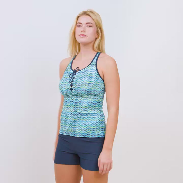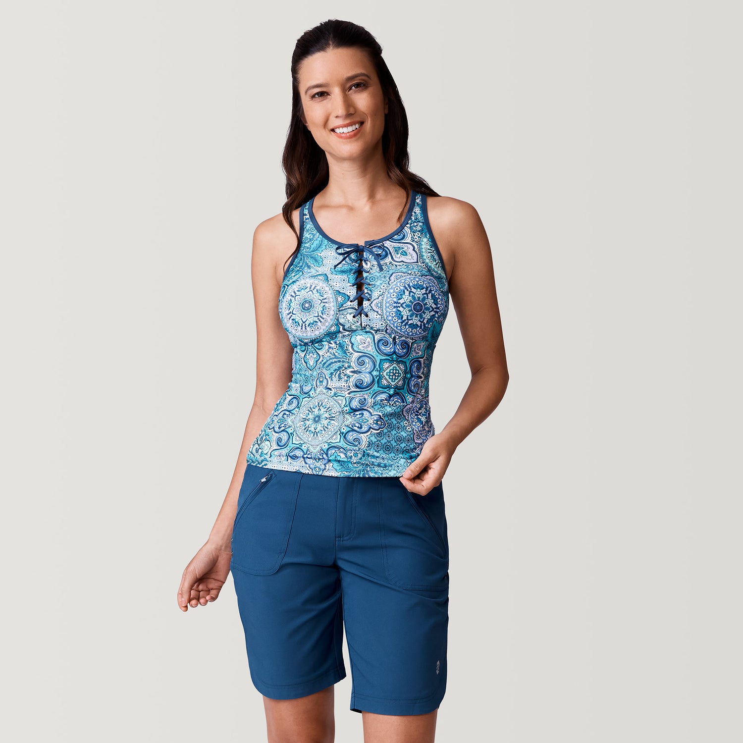 Comfort meets coverage with this sporty and stylish tankini top in a fun and modern medallion print. With elevated details like a lace-up front and multi-strap racerback, it’s the ideal addition to any swim wardrobe or active lifestyle. Set-in molded cups and a full-coverage silhouette provide enough support that you'll be ready to splash, dive and lounge in confidence.