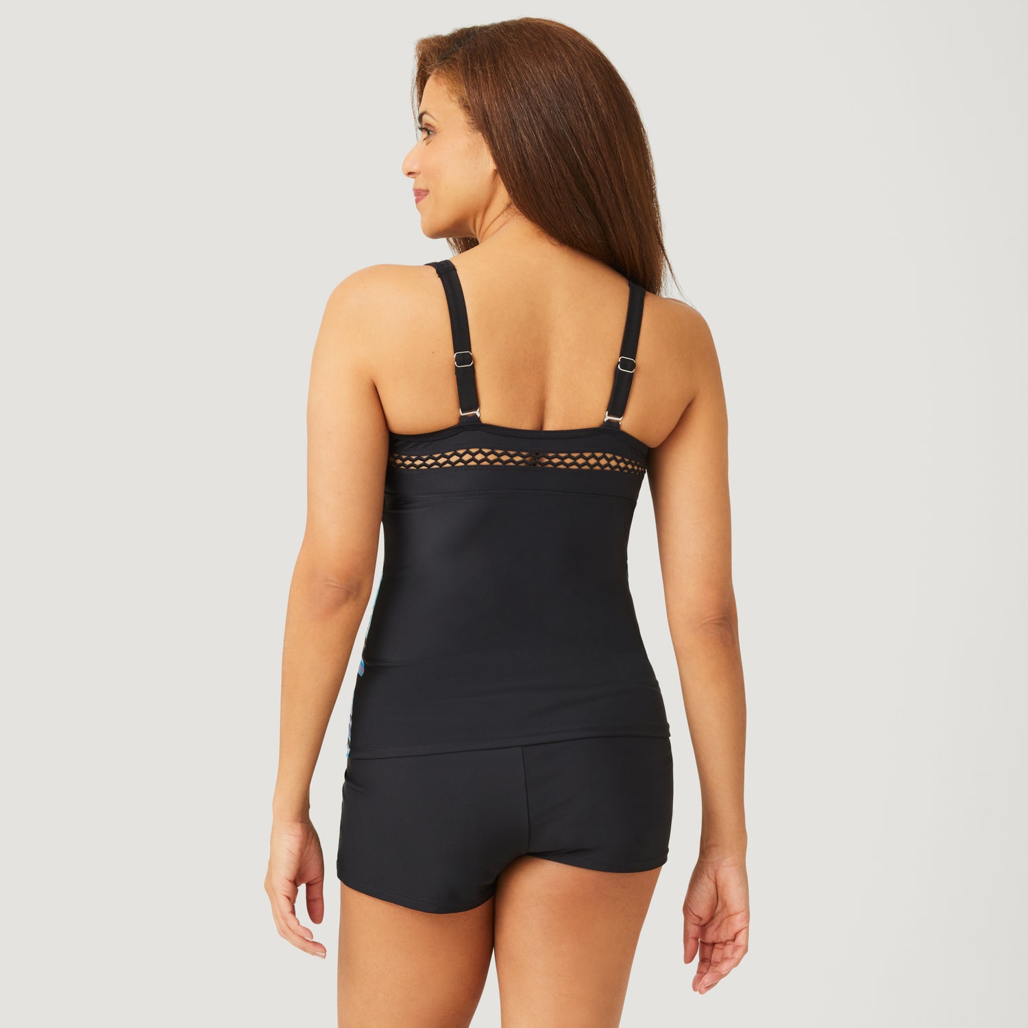 An athletic-inspired cut with crochet details offers full coverage and comfort for long days at the beach. Find your fit with supportive wide straps that are both adjustable and convertible to a cross-back option, in addition to removable bra cups. The quick-drying, four-way stretch material make this tankini versatile enough for swimming, or as an alternative to active wear.