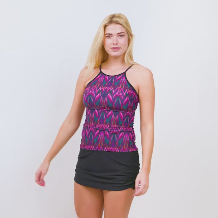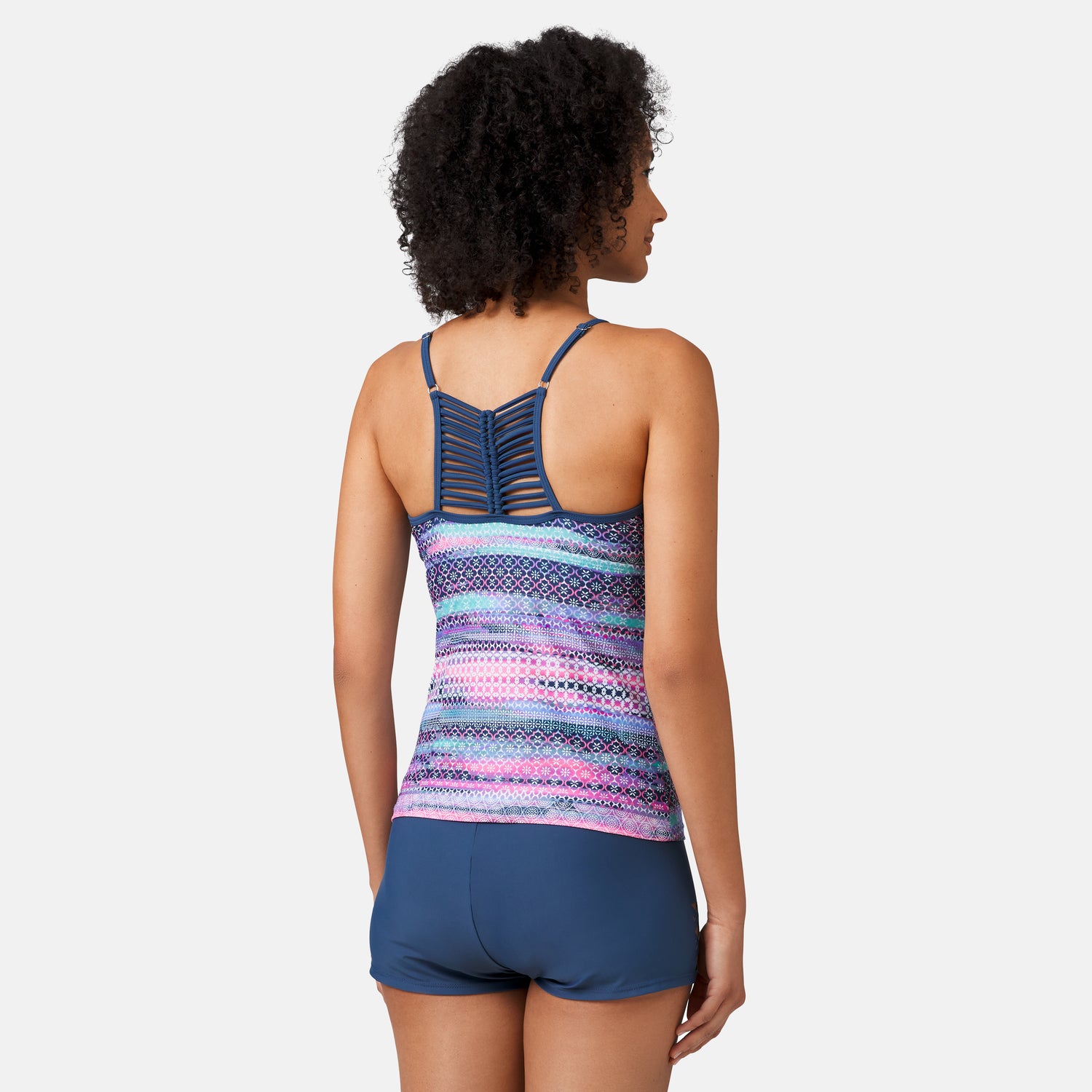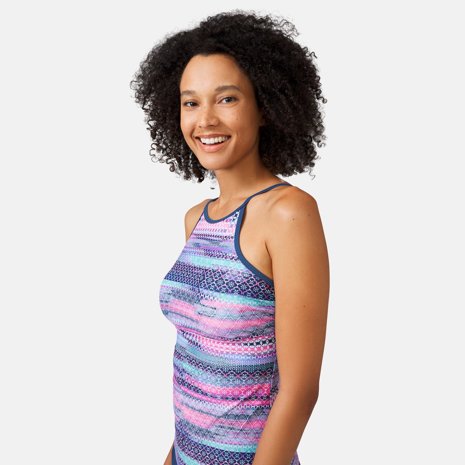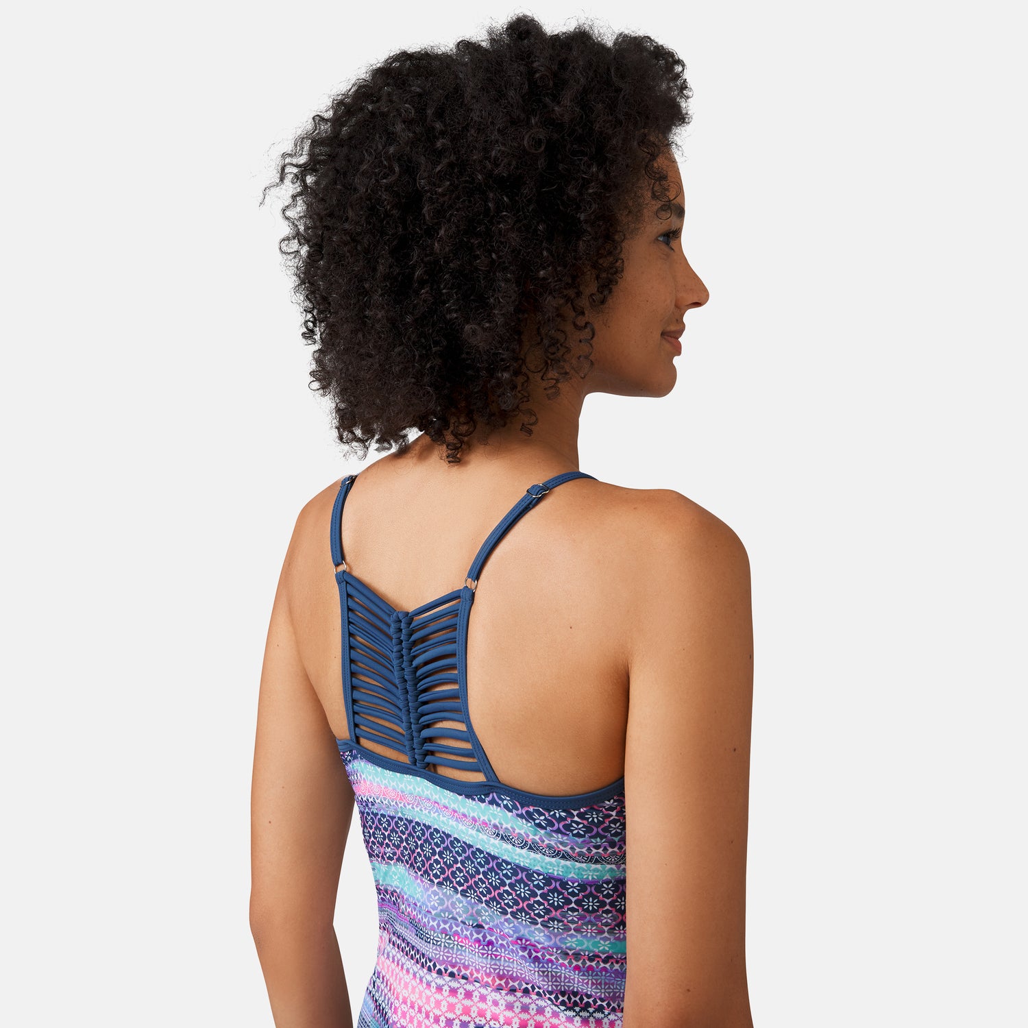 This colorful and fun graphic tankini top is stylish enough to wear with jeans, but packed with performance details for swimming and sunny day adventures. The macrame back detailing adds a hint of fashion without sacrificing function: there’s a comfortable and anti-pill four-way stretch material, plus adjustable straps and set-in molded cups for support. The high-neck design, UPF 50+ protection and quick-drying design keeps you covered but cool during any action-packed outdoor activity.